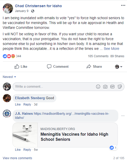 Multiple state legislators jumped on board the anti-vaccination outrage messaging to share Health Freedom Idaho’s content.