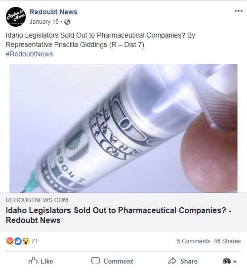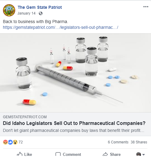 Here Representative Giddings attempts to convince readers that Big Pharma is controlling Idaho Legislators through broad accusations and zero evidence or examples of actual influence on campaigns. This article leaves out critical factual information to inform the reader of any viewpoint other than her agenda. Continually impugning the integrity of other legislators by insinuating they are “on the take” is, in our opinion, highly questionable behavior of a legislator entrusted with making Idaho laws.
