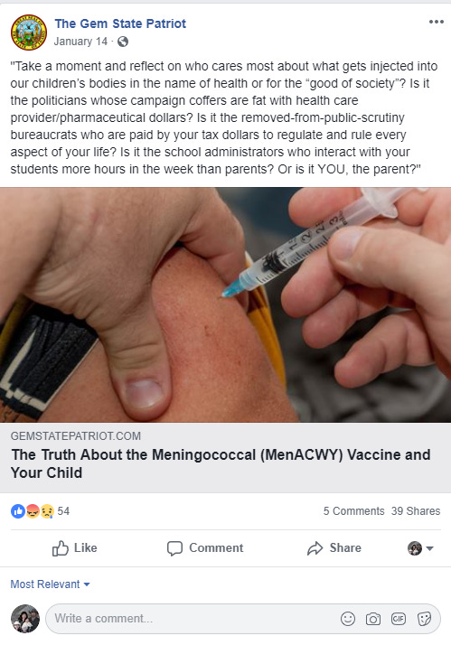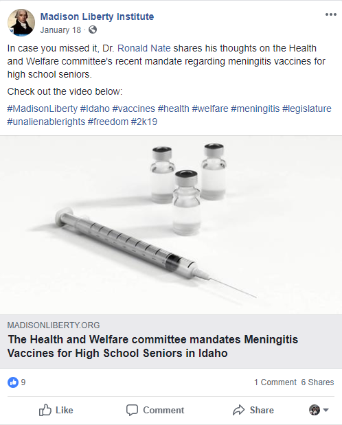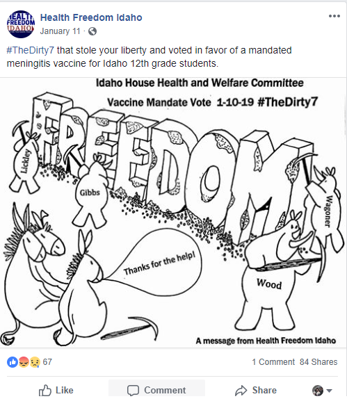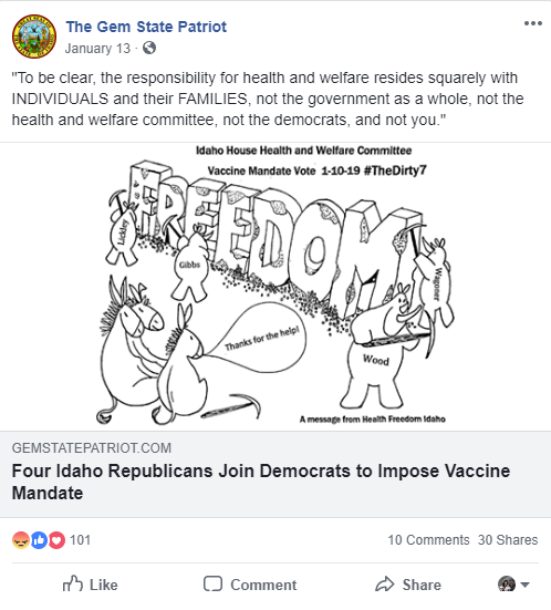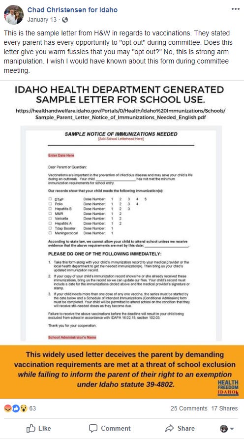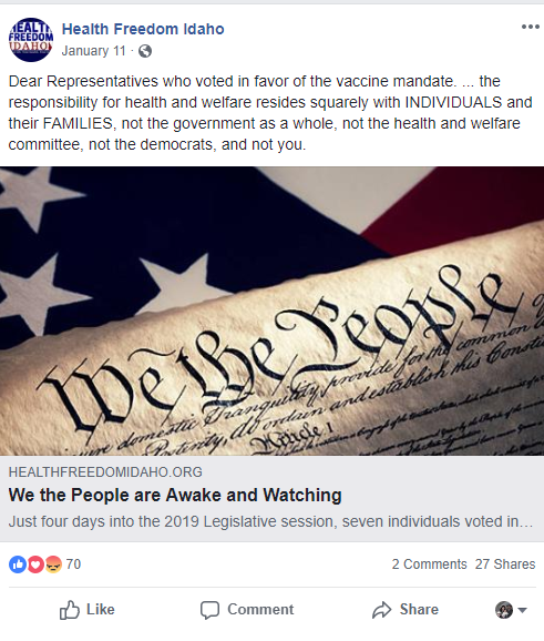 Health Freedom Idaho, a group that actively promotes anti-vaccination narratives posted this on their Facebook page: