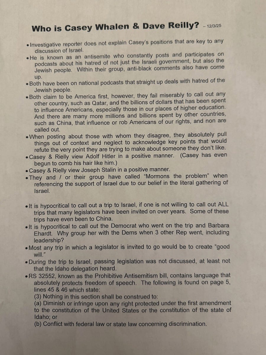 Rep. Barbara Ehardt deserves credit for attempting to correct the record by sharing a flyer documenting Casey Whalen’s public history and associations. The flyer noted that Whalen and his close associate Dave Reilly have appeared on national podcasts centered on hostility toward Jewish people and that both have expressed favorable views of Adolf Hitler and Joseph Stalin. Those facts directly undermine any claim that Whalen should be treated as a credible or neutral speaker on Israel or constitutional ethics.